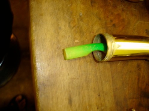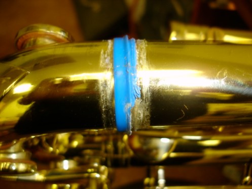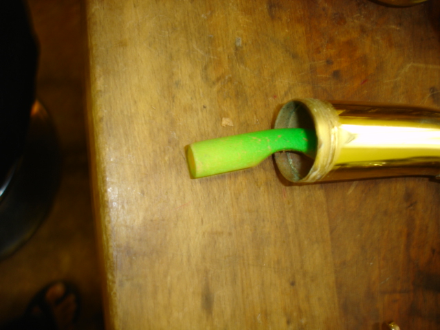 Recently I was contacted to look over a baritone saxophone that had spent repeated trips to another repair shop in town. The instrument played poorly, and its’ intonation was off by a quarter step. The first thing I found was that in re-securing both the U-tube and the bell section, plumbers tape was used. Selmers come from the factory with a glue seal overlaid with a heavy clamp. The plumbers tape leaked, and both joints were loose, allowing the two sections to flex. Thinking that I had the problem diagnosed, I took the upper U-tube to the sink to wash out. Normally lots of muck deposits itself in the bottom of the tube. Imagine my surprise when I ran a brush thru it and out came a Nerf dart. A previous tech had resoldered the main brace on the pipe, and melted the dart into the metal. Te body tube had suffered severe damage, which i presume is why all the joints were taken apart. The body tube had some dent work done, but all the keys in the upper stack had play in them – some as much as 1/16″. Swedged the keys, replaced a few pads, properly assembled the horn and enjoyed conducting an extensive playtest.