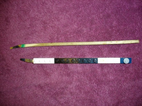 While working on a flute yesterday I decided it was past time to replace the mylar on my feeler gauge. Usually I prepare several at once using bamboo sticks with mylar glued to the end. Instead, I got creative with some legos. It weighs about the same as the bamboo stick, with the added advantage of ease of replacement – when the mylar goes bad, the legos unsnap, and a new piece can be inserted. Goofy, and slightly geeky, but functional.