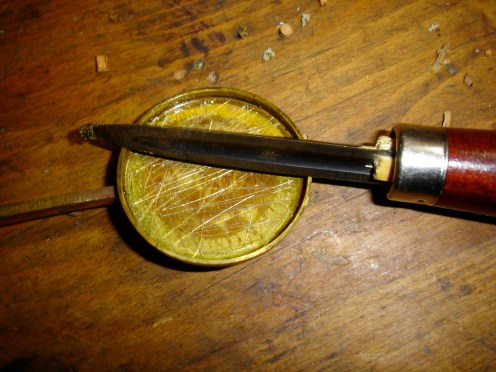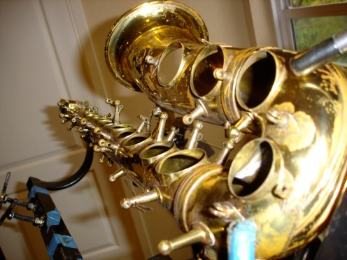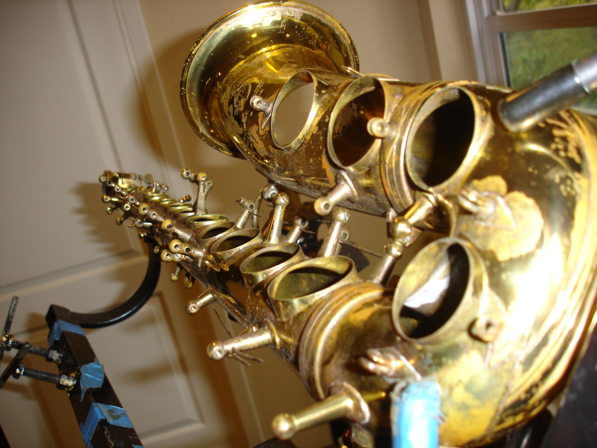 Over the next few months I will be documenting a large saxophone job.  The saxophone is a Selmer Mark VI alto saxophone, serial number 204xxx, dating from 1972.  The lacquer on the body is average, but it has not been buffed and re-lacquered. The finish on the keys  is almost completely destroyed.  Part of the job will be cleaning and tending to the metal, in hopes of preserving what is left of the original lacquer, as well as protecting the necked brass. The only structural damage I have found thus far is a small ding on the bell.